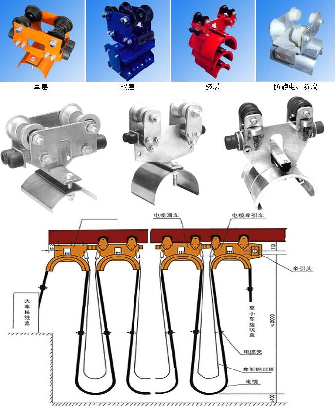 GHC系列工字鋼滑車分為中載荷型、重載荷型、和輕載荷型,因此滑車走輪為Ф80、Ф63、Ф50的三種,承載能力≤50~150kg,每類按托板層數分為單層、雙層、三層,每類中有三種形式,首端為電纜牽引車,終端為固定掛線架,中間為電纜滑車。