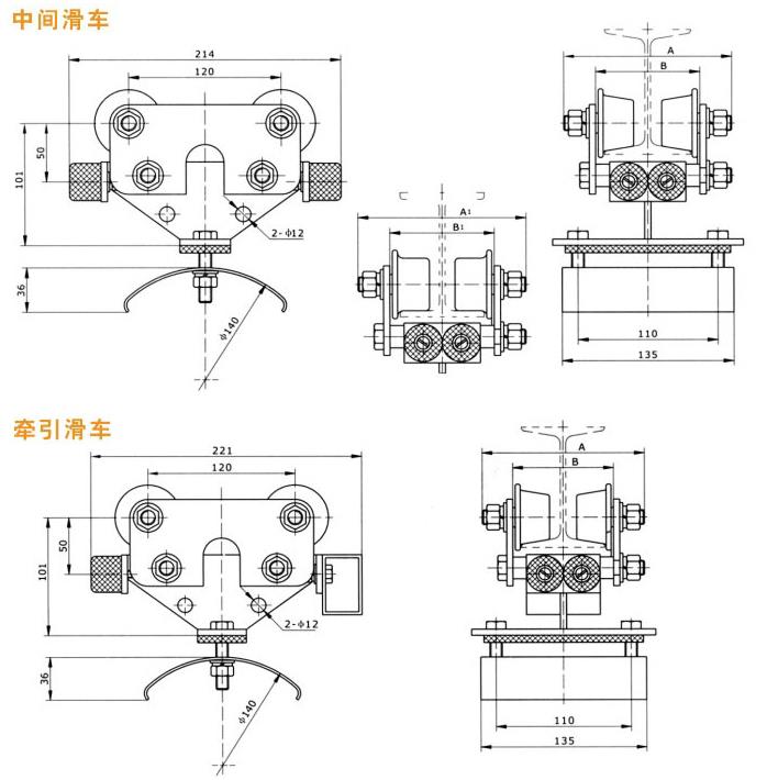 分為中載荷型、重載荷型、和輕載荷型,因此滑車走輪為Ф80、Ф63、Ф50的三種,承載能力≤50~150kg,每類按托板層數分為單層、雙層、三層,每類中有三種形式,首端為電纜牽引車,終端為固定掛線架,中間為電纜滑車。